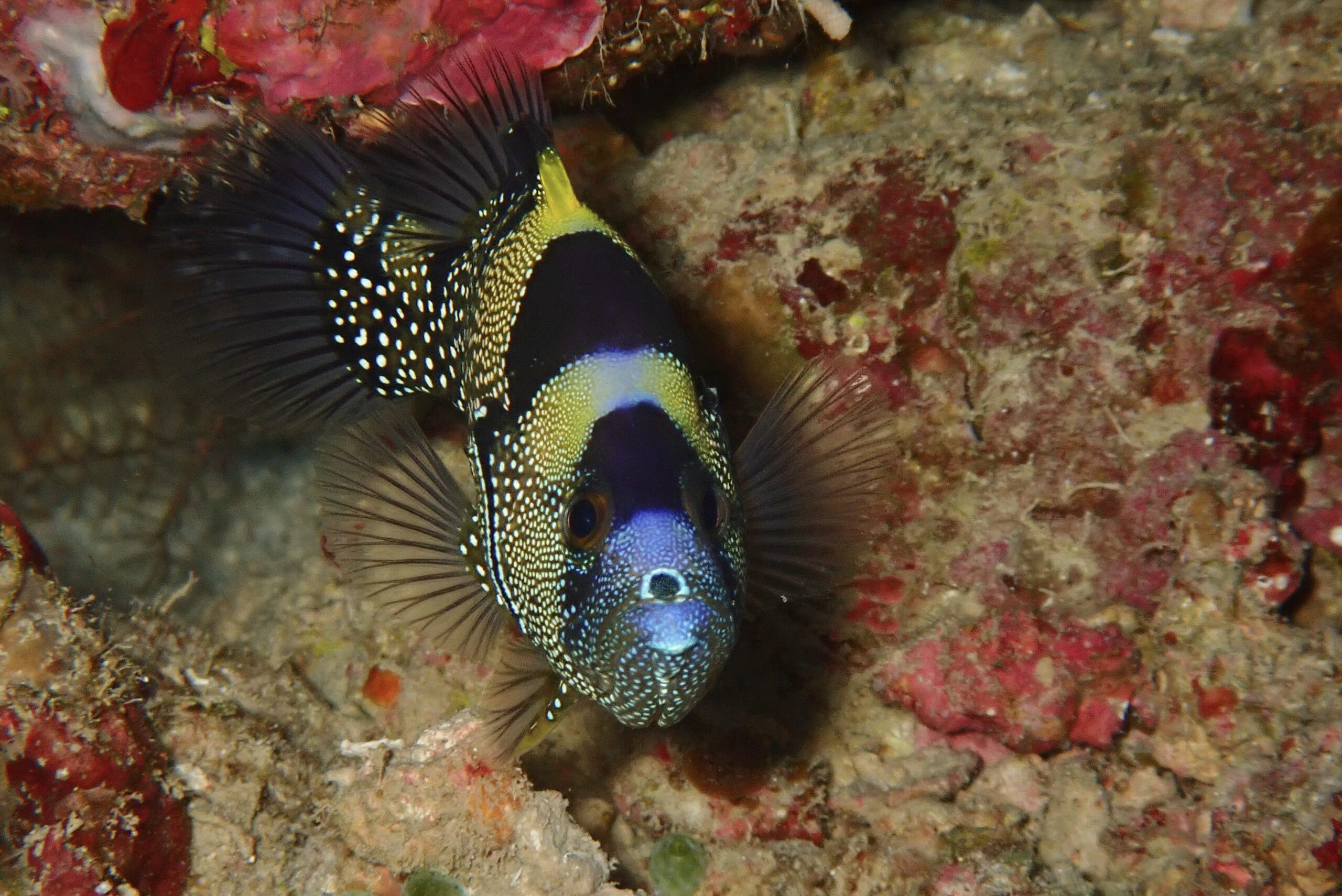 まだ小さいアゴハタを深場で見つけました。沖縄島では珍しいハタ科魚類です、トレードマークの下顎のふさふさはまだ伸びていません。